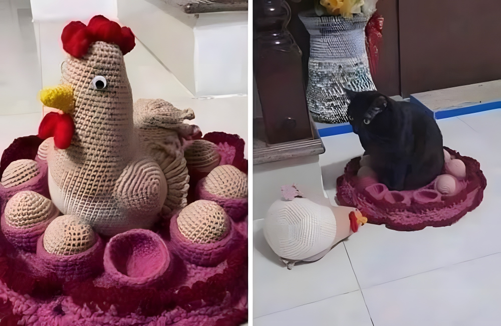 This cat owner brought a stuffed hen sitting in a circle of its own eggs, but their catto couldn’t bear the house’s attention-getting diverted. So, as soon as the cat’s parent directed their time somewhere else, the catto snatched the hen from its abode and sat in its place. The second picture shows the hen lying on the floor lopsided while the cat basks in the glory of its new place. How naughty!