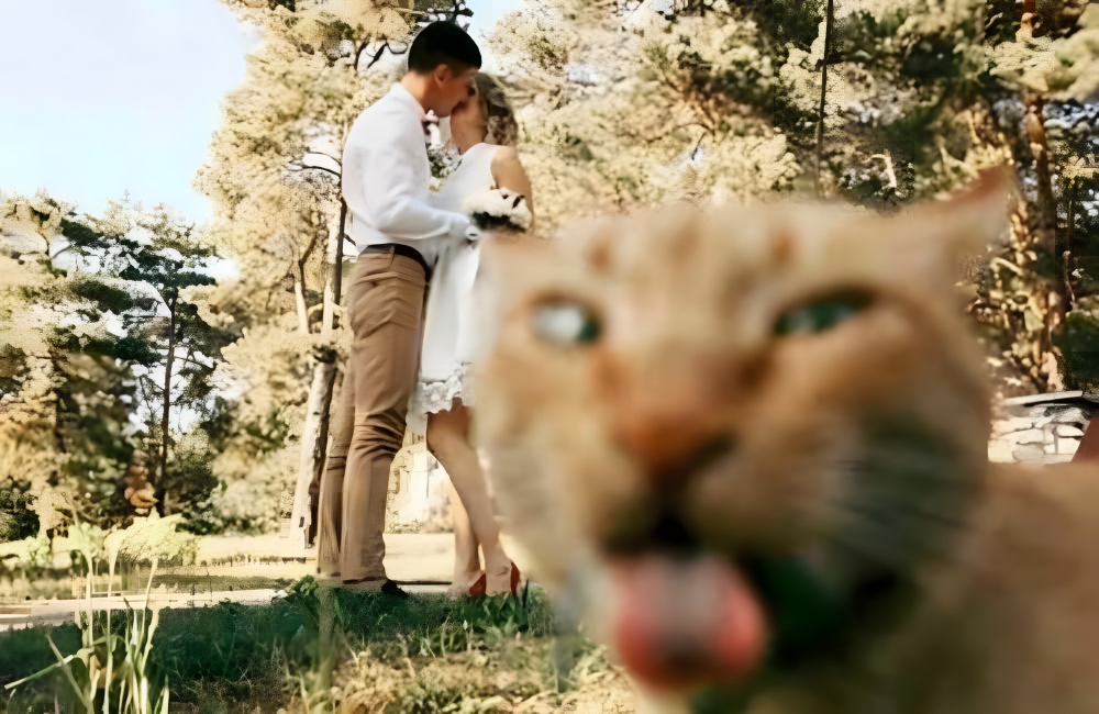 Cats are one of the most curious pets you can keep. If you are a cat parent, you can relate to them poking their furry little paws in everybody’s business, not just their owner’s! This image is the perfect testament to this fact, as it features a cat indulging in the famous Einstein pose while the couple at the back indulges in something else.