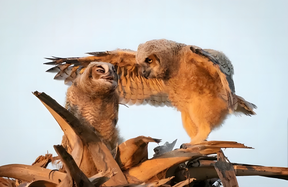 Caught in the golden embrace of the setting sun, Mark Schocken paints a family portrait that transcends species. The image is a delightful representation of sibling rivalry, where the elder, larger owl appears to be in the middle of a stern lecture, while the younger one tilts its head, either in defiance or playful innocence.