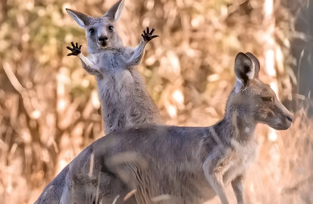Amidst the golden tufts of the Australian bushland, Lara Mathews captures a hilarious moment of pure, unadulterated mischief. While one kangaroo seems poised, dignified, ready for its close-up, another mischievous roo pops up behind with a delightful “Ta-da!” pose.