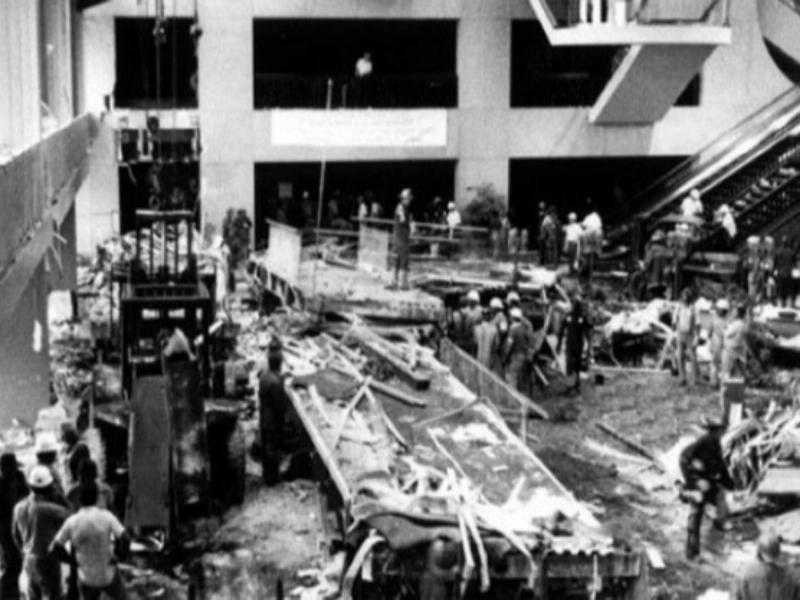 On July 17, 1981, two hanging galleries that were positioned one over the other fell during a party in the hotel’s atrium. 214 individuals lost their lives in the catastrophe, and 216 more suffered critical injuries.