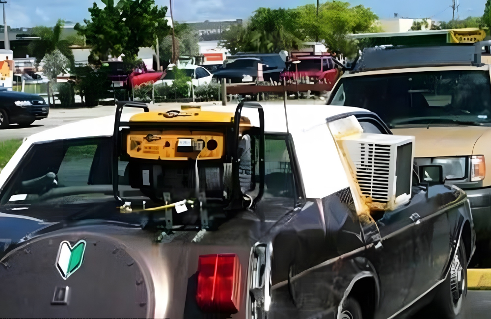 A window unit is $289, and, if you rip it out of your house as this guy did, you don’t have to buy anything new. The AC unit is only part of the mystery and intrigue of this photo. The other question is what exactly the car owner has mounted on the back hood.