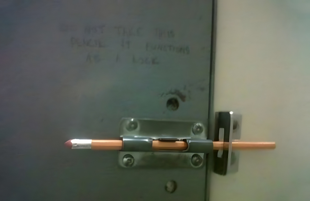The scrawled, hostage-note-like writing on the wall says, “Do not take this pencil, it functions as a lock.” Someone’s Home Alone-esque idea of home protection involves inserting a pencil (unsharpened) into the slot of a lock and hoping that it’ll hold. Unless the burglar is really weak, there’s no chance of this working.