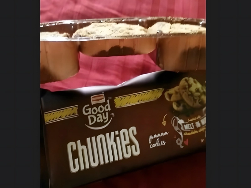 It’s a little difficult to determine what you’re looking at at first. But Britannia’s Good Day Chunkies are a uniquely formed cookie packet that can only be misleading. Though only the first and last cartons are filled, the box gives the impression that there should be three identical rows of “Chunkies.”