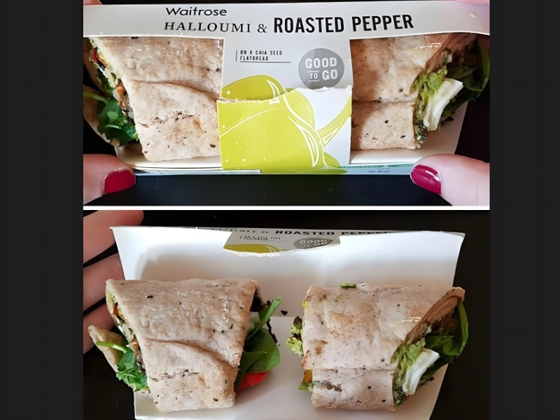 The Waitrose package with roasted pepper and halloumi is another dubious item on our list. The customer thought there would be one sandwich when she purchased the bundle. But what she actually received were two small sandwiches: one with halloumi, a sort of brined cheese that is sometimes used in place of meat since it is simple to cook and grill, and another with roasted pepper.