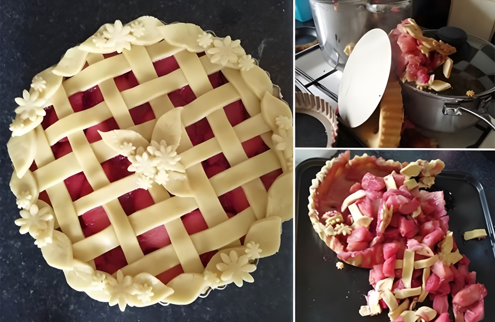 All was good in this baker’s kitchen until the pie decided to slip out of his hand and spill open. We could have advised him to salvage what was left, but even that doesn’t seem doable in a scenario like this one.