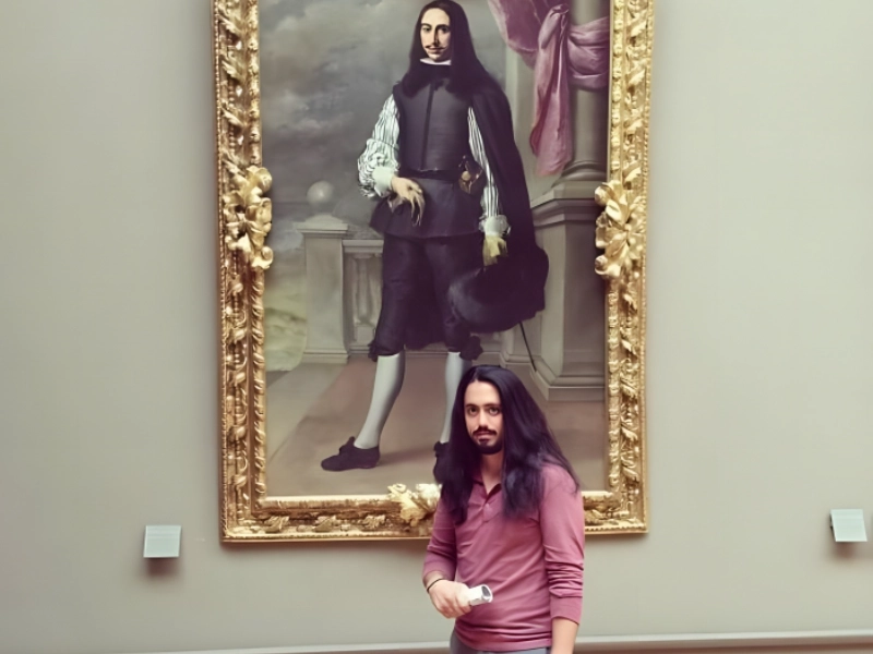 The guy in the portrait is named Íñigo Melchor Fernández de Velasco. He was a Spanish nobleman who lived around the late 17th century. However, from this photo, it would appear that he is back in form of the gentleman in front of the portrait. This guy was at the Louvre in Paris and noticed that he bore a striking resemblance to the person in the portrait behind him.