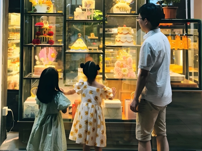 Regardless of our nationality, everyone is essentially the same. These two photo subjects are infatuated with a set of princess cakes, and little girls are often drawn to princesses. One must wonder if they can convince their father to purchase one or two for them.
