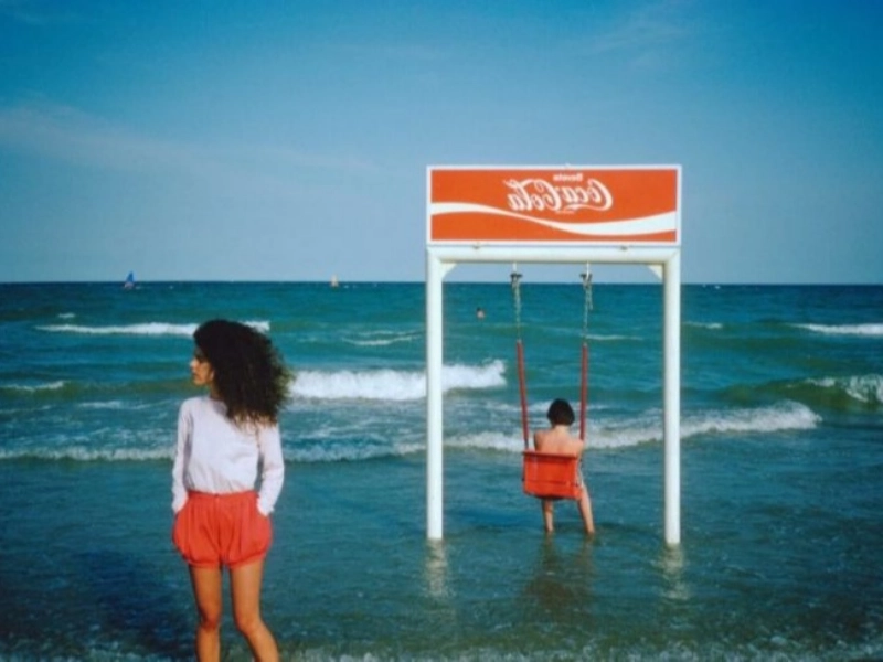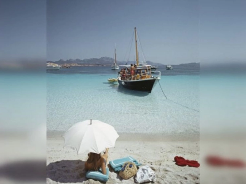 A beautiful woman in a colored picture on a beach in Italy