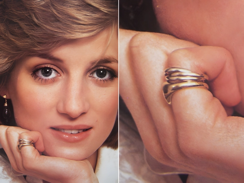 Princess Diana owned a large collection of rings, nearly all of which featured unique stones. She wore a variety of rings set with diamonds, aquamarine, and emeralds. The Princess wore a Cartier trinity and signet ring in 1983 at a Kensington Palace picture shoot with Tim Graham. Given that Diana received the signet as a gift before the wedding, the ring had the Prince of Wales’ feathers.