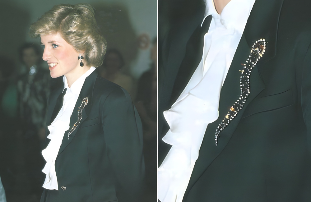 This snake brooch was among one of her favorites in the vast collection. The Princess first was spotted wearing it in British Columbia in 1986. The vintage brooch is hard to find, and resales of the unique serpentine brooch usually cost between $500 and $1,000.