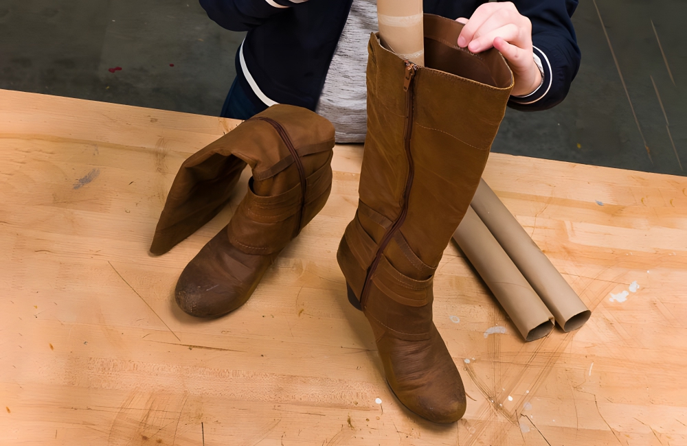To keep tall boots packed upright, use paper towel rolls. Stick the empty roll into the boot (vertically, of course), and do the same for the other half of the pair. This will keep your boots from getting misshapen while they are stored for spring and summer.