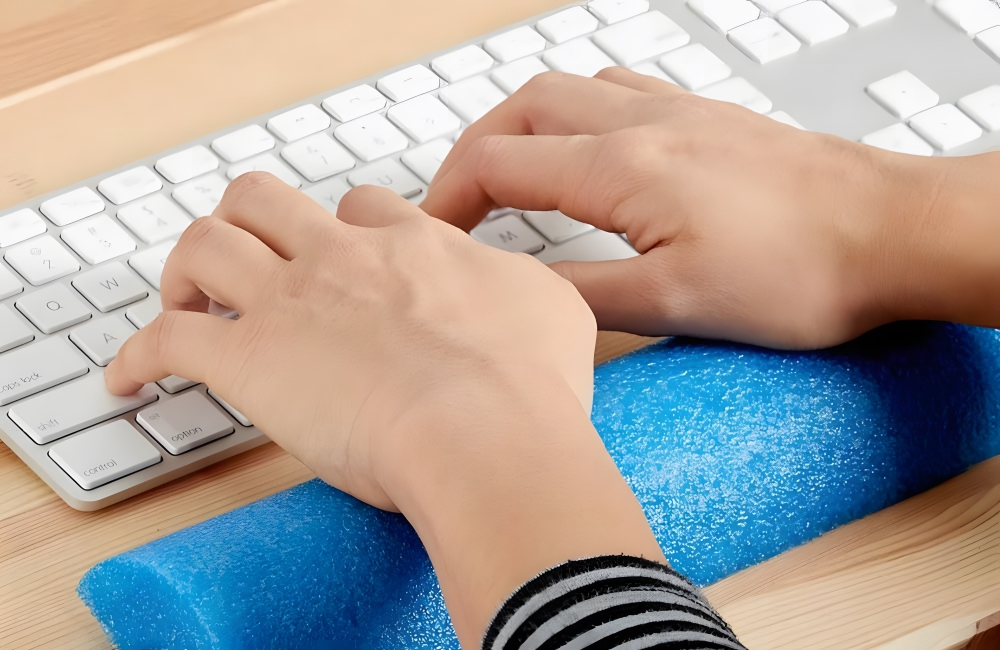 Cut a chunk of the pool noodle off vertically, and then halve that portion. Place it in front of your keyboard to prop up your wrists, supporting them as you type. The tendons and muscles in your wrists and hands will thank you for this hack.