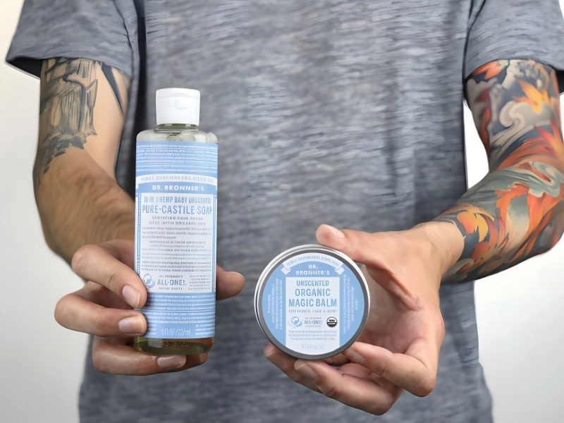 The healing process is accelerated by air flowing over the tattoo wound. Vaseline (or Neosporin, alcohol, lotion, etc.) applied to a freshly inked tattoo runs the risk of infection. Make sure to use a gentle soap, such as Bronner’s Castile, which is highly recommended by tattoo artists, to clean the tattoo wound.