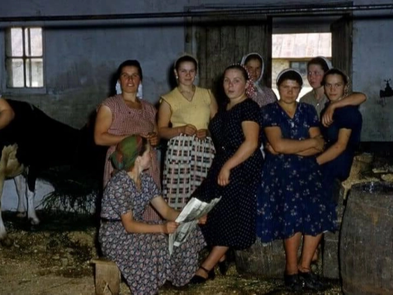 On their lunch break, milkmaids at the farm discuss the latest news from their working day.