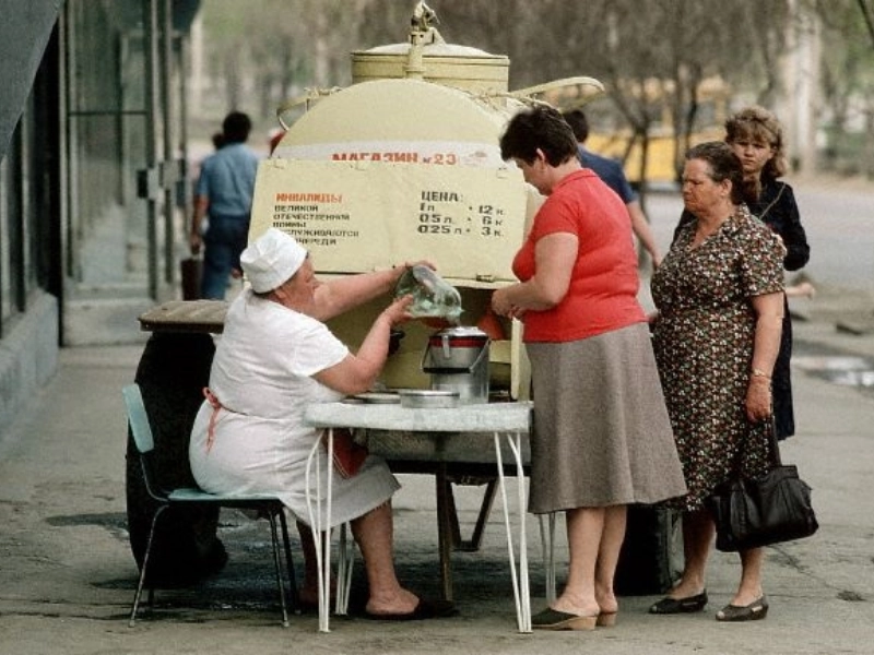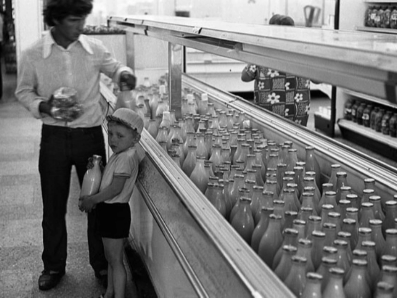 A boy and his father are purchasing milk. Novokuznetsk, 1983, in a wait for dairy. Moscow in the 1990s.