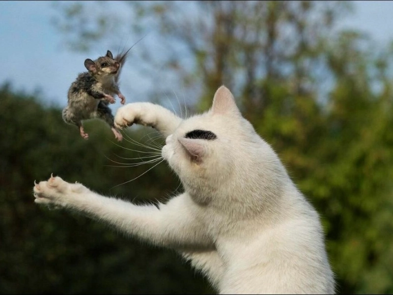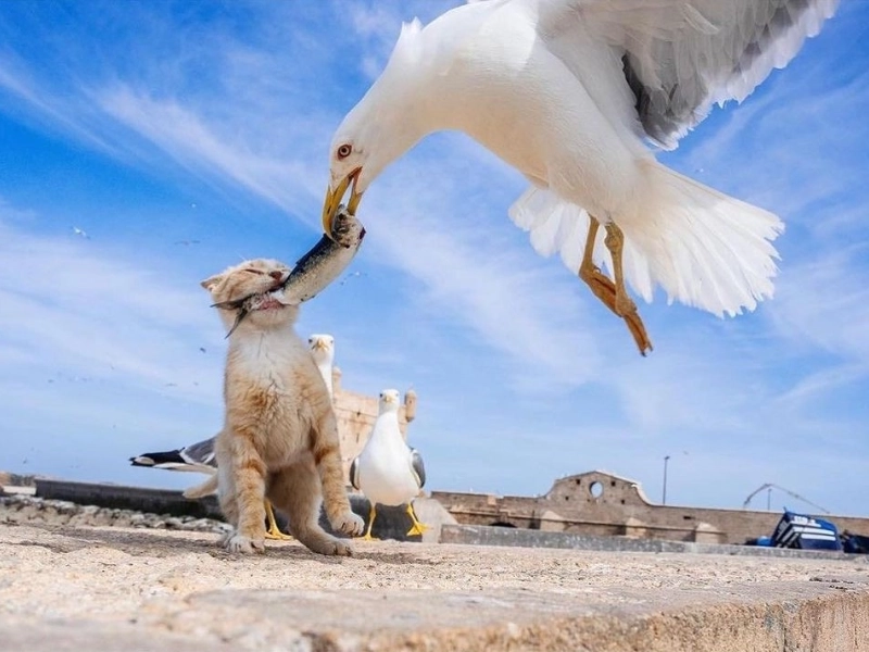 Le chat n’a pas eu de chance d’être entouré de mouettes.
