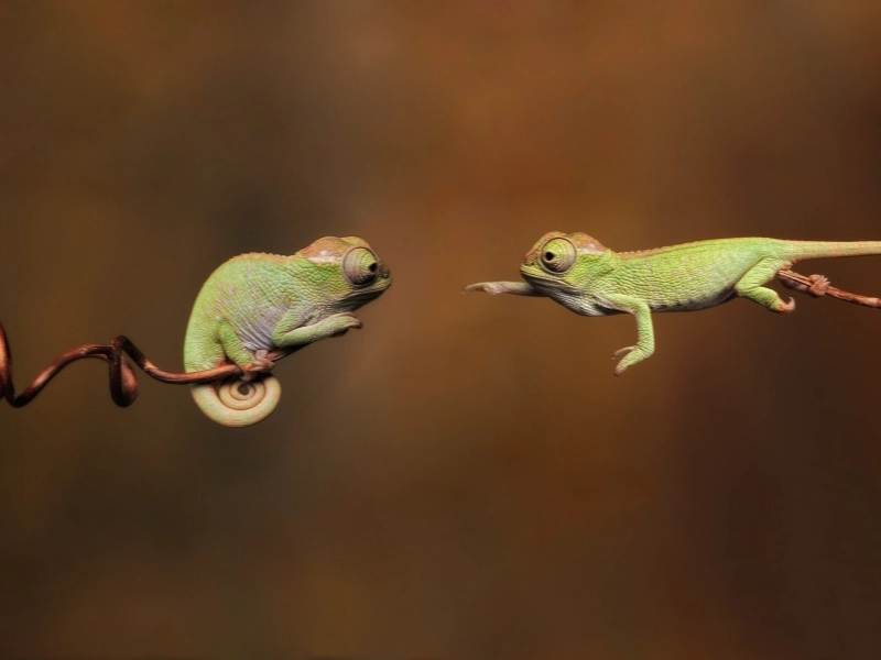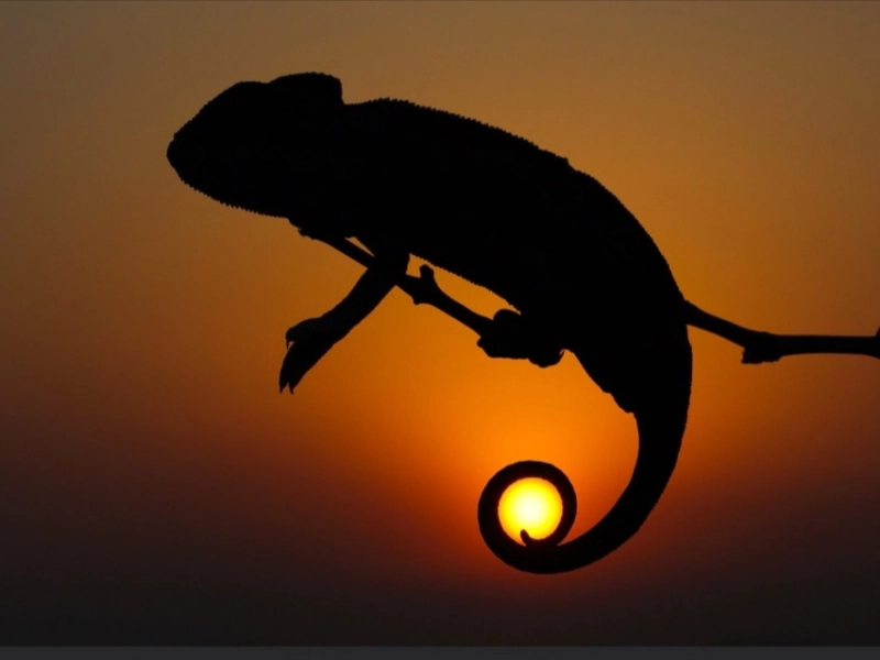 Un caméléon avec le soleil perché sur sa queue