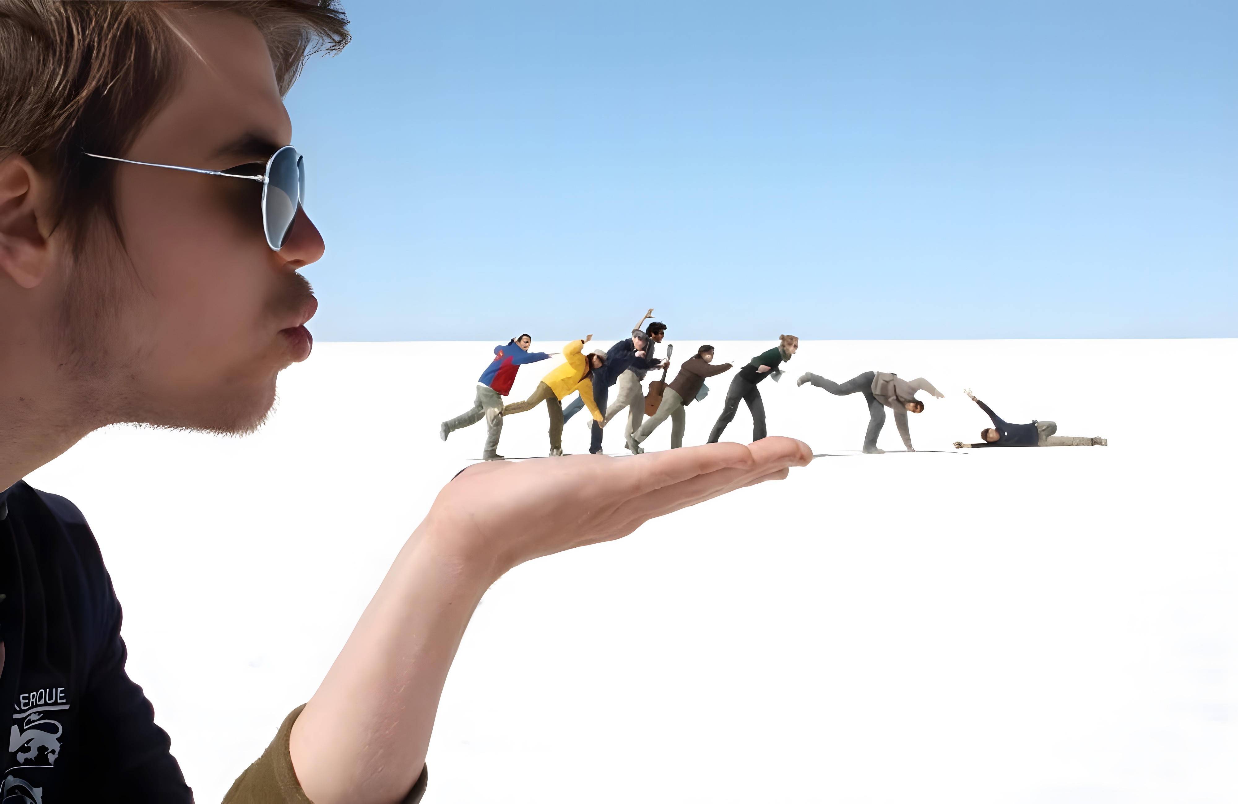 This optical illusion-filled photograph comes from Susan Cantrell’s collection of forced perspective group photography. It showcases one person blowing on his palm and foregrounding the group of people in the backdrop seemingly falling over from his blow.