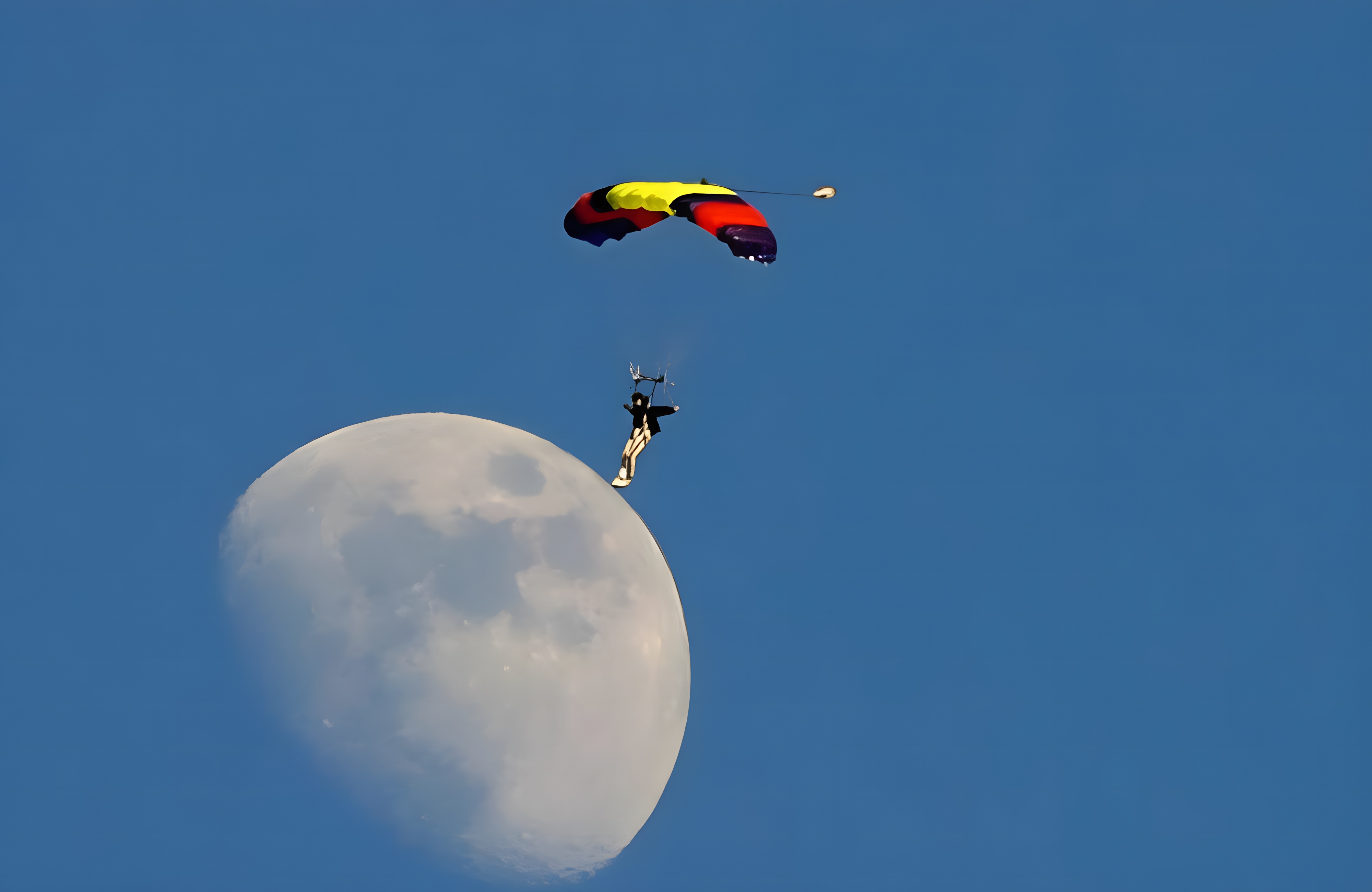 The moon is actually hundreds of thousands of miles away from the parachuter, but his accurate angle and the swiftness of the photographer make it seem like the parachuter is simply having a stop in the sky, resting his legs on the surface of the moon.