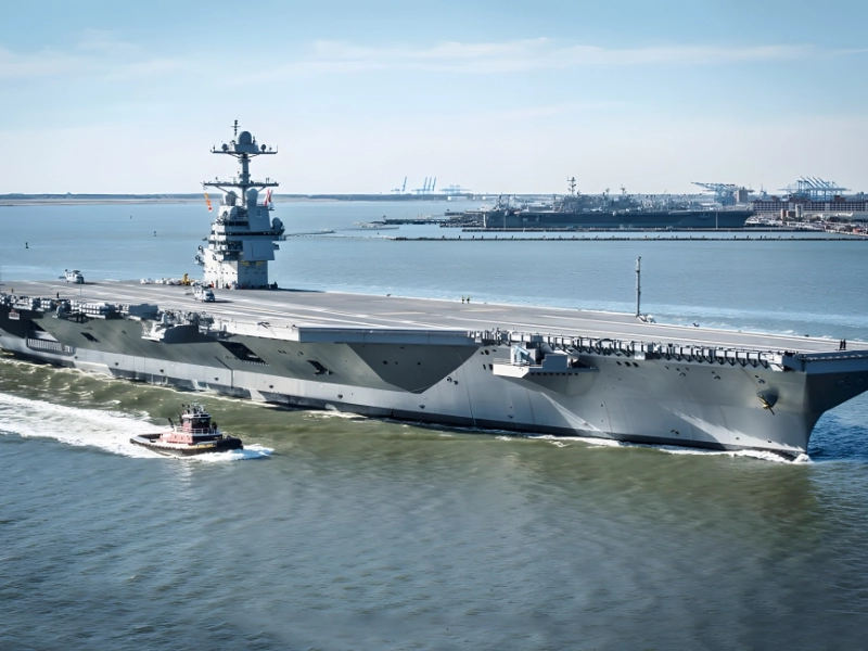The USS Gerald R. Ford is the class’s flagship aircraft carrier and is named for President Gerald Ford, who served in action in the Pacific Theater while stationed aboard the light aircraft carrier Monterey. Northrop Grumman and Newport News Shipbuilding produced it. Work on the project started in August 2005.