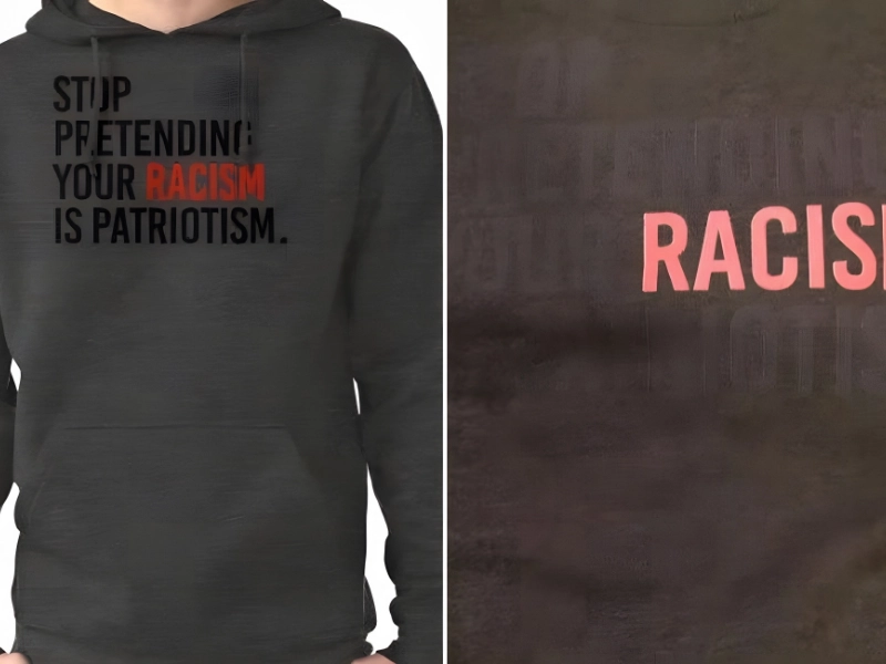 A t-shirt with the words “Stop Pretending Your Racism is Patriotism” is seen on the left. One customer was motivated to buy the sweater by this political stance, only to discover that the business had made a printer error.
