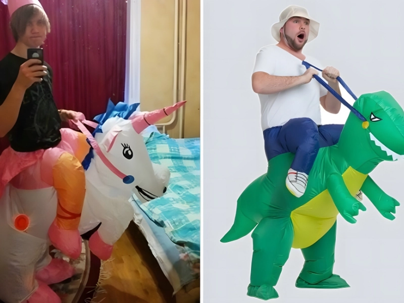 Certain individuals take their Halloween costume selection quite seriously, making sure to get the most outrageous outfit they can find. The intended image of this online-purchased outfit was a man atop a blow-up dinosaur.