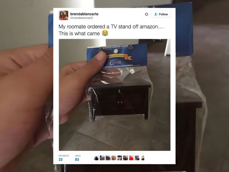 Twitter user @brendablancart2 claims that when her roommate ordered a TV stand from Amazon, what arrived was a Classics Quality Dollhouse TV Stand, which cost less than eleven dollars.