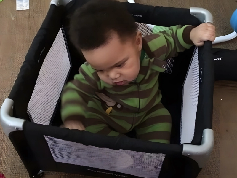 This playpen will definitely need to be returned or used for something else because the baby can’t even turn around in it. In fairness, the baby appears to be handling things well; rather than being upset, he is just confused.