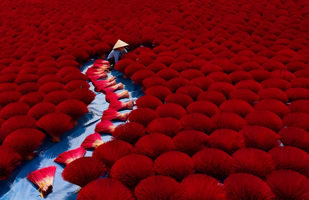 In Khanh Phan, we see a behind-the-scenes look at how incense is made. In this vibrant red photograph, a woman is drying bundles of red incense sticks. Such a vibrant photograph could have been taken using a camera like the Canon EOS-C300-MK-III, which is a cinema-quality camera known for its clarity.