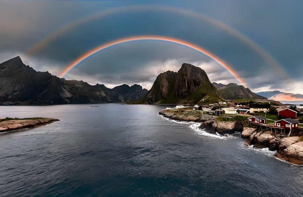 Paul Lund was driving over a bridge in the Lofoten Islands in Norway when he saw a sight so beautiful that he had to stop, even though there were cars driving behind him. There was a double rainbow in the sky, crossing over the partially-submerged Norwegian mountains. Lunde parked quickly, took some snapshots, and got back in his car and drove off.