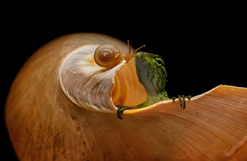 Andi Halil caught this unlikely animal friendship blooming between a lizard and a snail, who appear to be giving each other a peck kiss to say hello (though that’s not likely what really happened, it’s nice to think they’re best friends). The Indonesian photographer titled his picture “The Best Friends.”