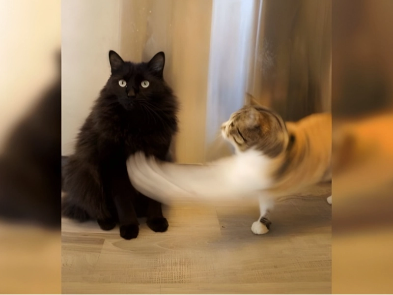 Visual evidence of a cat assault. This amazing picture shows a moment of feline violence, therefore illustrating visually the predatory instincts of a cat in action. Most likely, the picture shows a domestic cat vigorously pursuing its target or in mid-pounce. The scene can depict the cat with teeth bared and claws extended, its body twisted in a traditional assault posture. To surprise the audience, the attack’s target could be anything from a hapless toy to an unaware bird or rodent. The photographer clearly froze this split-second of action to capture the cat’s eye intensity and muscular tension. The background might set the scene: maybe a home room where the difference between a pet’s wild life and its tamed one is highlighted, or an outside location showing the cat’s hunting ability. This picture not only reminds us of the natural activities of our pets but also shows the erratic and occasionally aggressive nature of cats, therefore subverting the idea of them as solely lovely and cuddling friends.