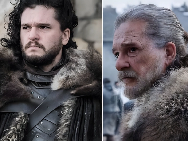 しわと白髪が多いことを除けば、CGI のジョン スノウの毛皮のコートは同じです。彼は、スキンチェンジャーの死後、シーズン3のエピソード9でオレルの鷲から左目の上に傷を受けました。
