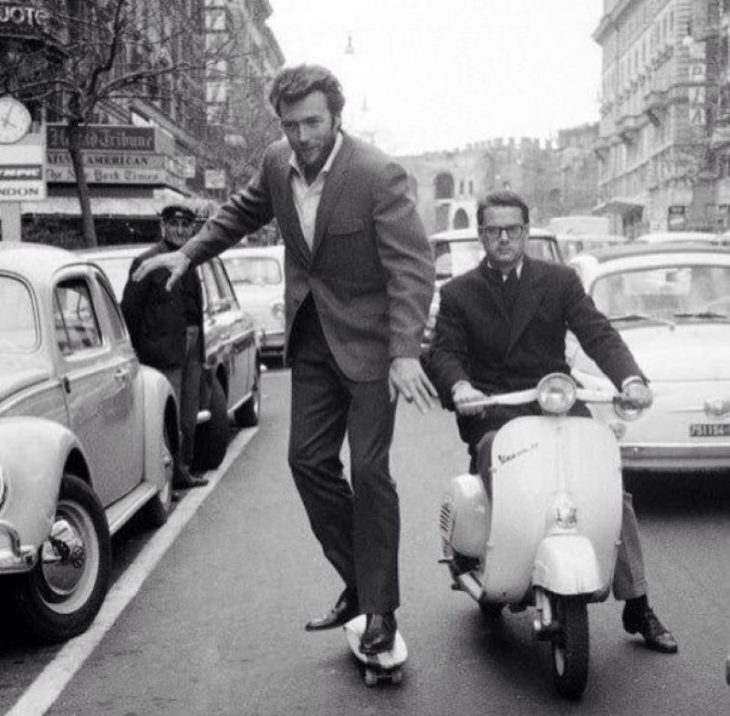 Clint Eastwood rides a skateboard in Rome, 1964.