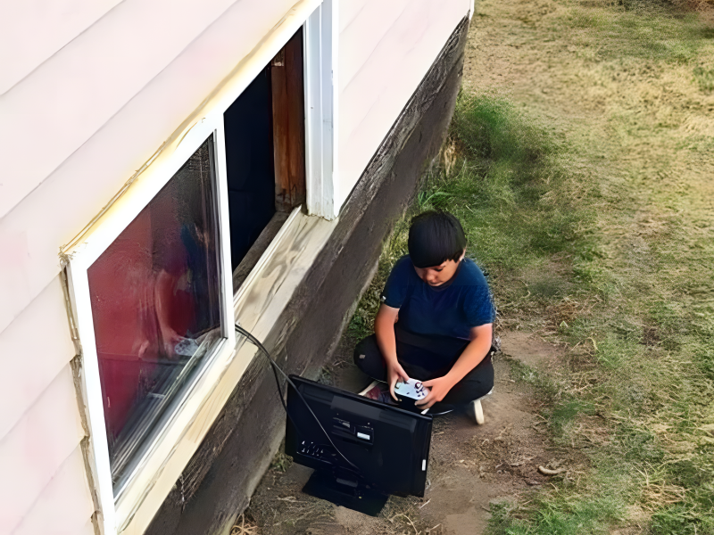 The picture you are looking at depicts outdoor play in its contemporary form. With the advent of the digital age, it’s likely very different from the version you experienced growing up. These days’ kids are so much less active, which is presumably why the boy’s parents wanted him to spend some time playing outside. He opted to play a game outside in the sun by just stretching his console out the window.