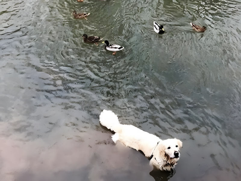 Unfortunately, no duck food was being handed up to any swimming or hungry canines in the lake that day, and his human parents did not fall for the last-minute, cunning deception.