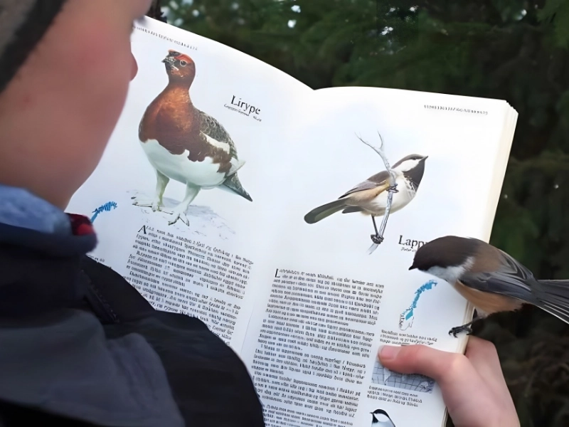 One inquisitive bird hopped onto the page while the man was reading about birds. Furthermore, it was a remarkable coincidence that the bird the man was reading about also happened to settle on the book.