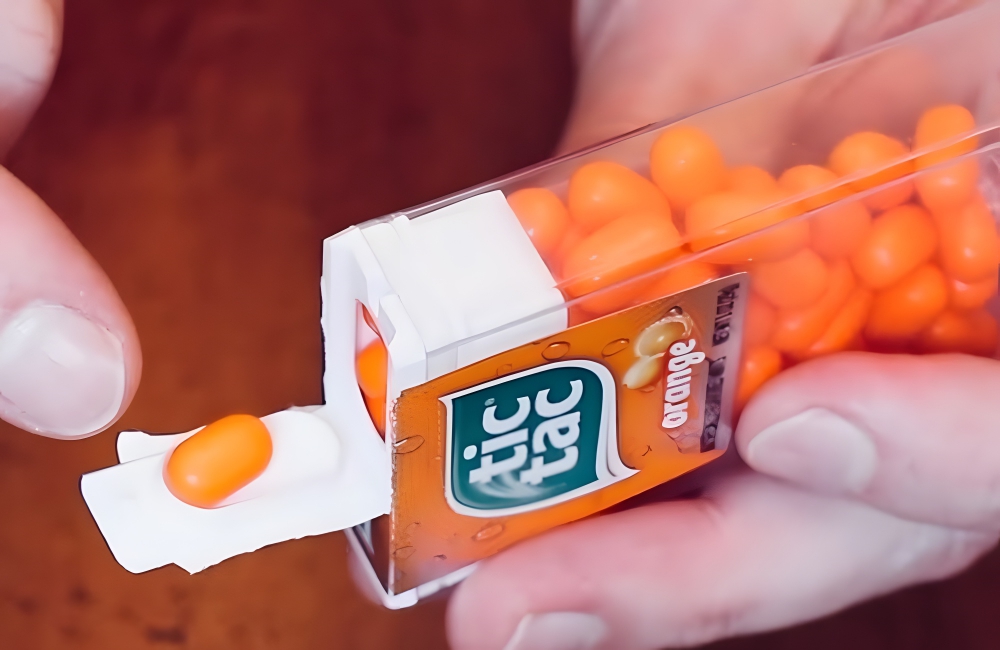 Tic Tacs help you keep your breath fresh no matter where you are. However, it’s often hard to just tap out one or two Tic Tacs at a time. The key to not spilling all of these mints is in the container. Turn the pack upside down horizontally, so that the lid, when you open it, is facing up.