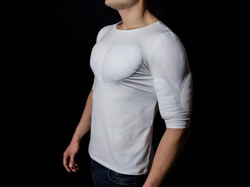 There are pads in the pecs, arms, back, and shoulder areas of the Danrich Muscle Shirt. It would be best worn underneath a t-shirt or anything more form-fitting. The shirt is sold out on websites such as Japan Trend Shop, although it retails for about $179.