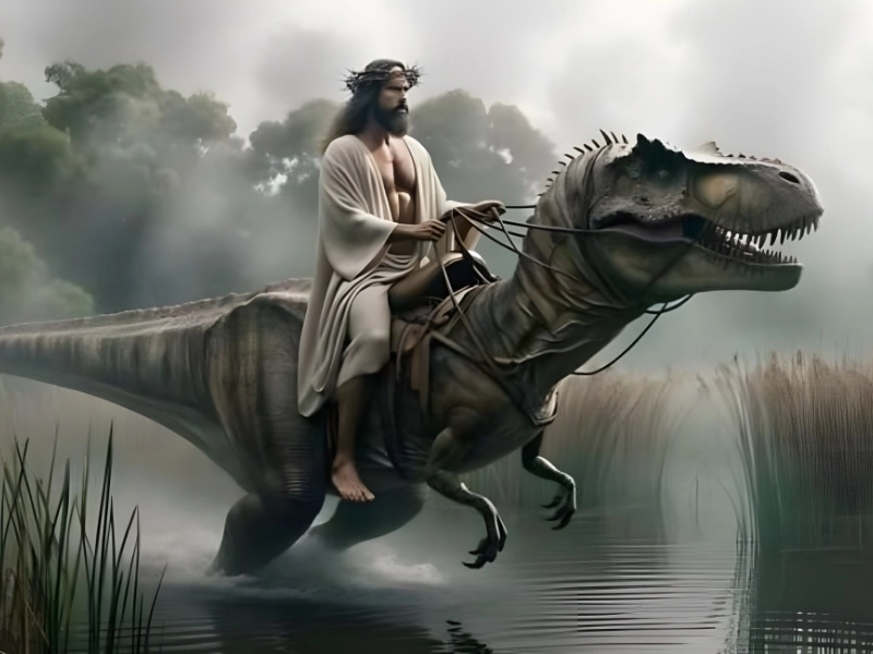 Facebook/@aigeneratednonsense/Jesus On A Dinosaur