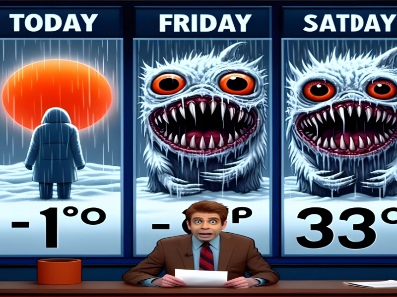 You may be able to relate to this image, depending on the weather and where you are. “Watch out for those snow devils,” Jeremy Dilley wrote in the description of this fictitious weather report that he shared on Facebook.