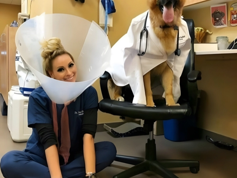 In this funny picture, a German Shepherd and his veterinarian trade locations such that the prestigious senior dog is wearing the lab coat while the animal doctor dons the cone of shame. They have even rearranged the clinic such that Doctor Doggo is seated at a desk while the vet sits next him on the floor! Though we’re not sure exactly what is happening, everyone’s smiling at least.