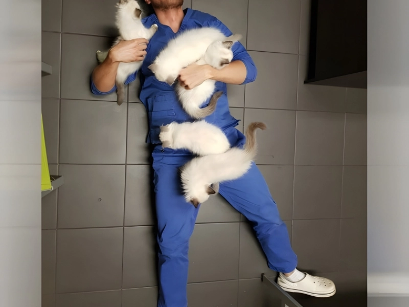 Though veterinary medicine is a serious business, occasionally animal doctors have to let loose and lie on the floor to interact with their furbaby patients. Regarding this veterinarian, he completely forgot he had a job to do and simply welcomed the kitty anarchy since he was so struck by the cuteness of these kittens. His expression conveys all – he is in heaven!