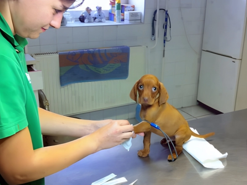 This small pup’s big, begging puppy dog eyes seems to have momentarily diverted even the focused vet, preoccupied with the current work.