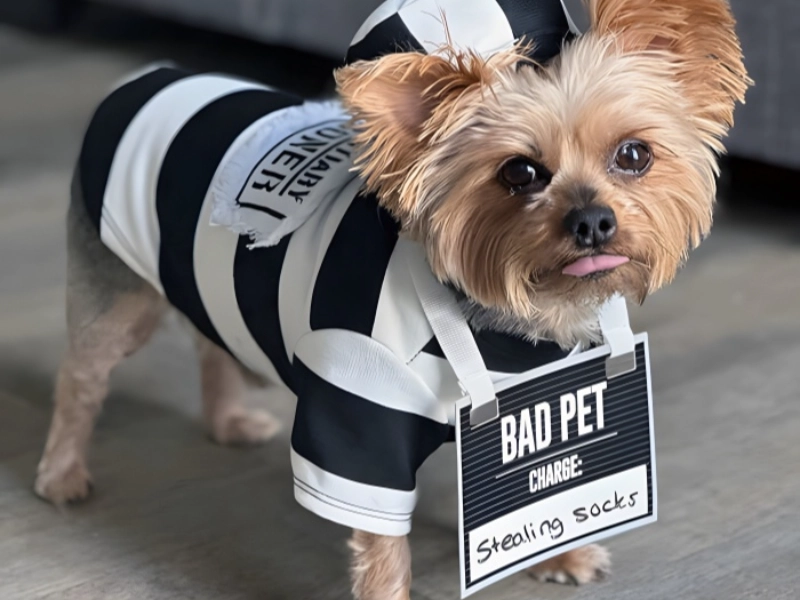 Anyone who has a dog will be aware that these animals have great personality; these little nuggets of personality will help you choose a pet Halloween costume much more easily. With regard to this little sock stealer, his pawrents knew just what they needed to outfit him. And when they had it, they hauled him straight away into his prisoner outfit. We believe that there are most likely many more canines around who should also be sporting this Halloween costume for dogs. So let’s wish for more of them to be available. With a prisoner number that might well be a count of all the socks he has taken over the years, the black and white striped jumpsuit fits very nicely with this pup’s cheekiness. The “guilty” look the dog keeps throughout—as if at last getting caught red-pawed for all his sock-stealing crimes—makes this outfit especially funny. To further realise this Halloween costume as a crime scene, the owners even made a temporary “evidence wall” of missing socks for the backdrop for pictures. It’s a great illustration of how often the genuine personalities and behaviours of our animal pals inspire the best pet costumes.