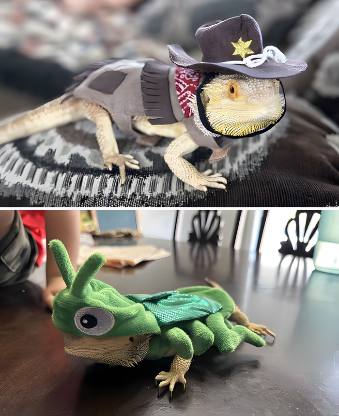 To be really honest, reptiles are a bit eerie. Thanks to their cold-blooded behaviour and capacity to shed their skins, lizards are exceptionally odd. However, even if some people find reptiles frightening, it appears that this lizard mother chose to design her costumes backwards Halloween. She decided to do the reverse and make her lizard look really friendly since some people already found her creature terrifying! Which look appeals to us more—the Sheriff or the eerie crawley? If we had to choose only one, though, we would have to choose the Sheriff. The metamorphosis is rather amazing; seeing a usually terrifying lizard wear a small sheriff’s badge and hat produces an unexpectedly appealing contrast. The owner’s artistic attempt to dispelling preconceptions about reptile companions reveals wisdom as well as comedy. The small outfit has been meticulously created to fit the particular body form of the lizard, therefore guaranteeing comfort and movement. Perhaps unintentionally tearing down boundaries between reptiles and humans one lovely picture at a time, the way the lizard seems to hold herself with extra dignity in her law enforcement duty is very fascinating.