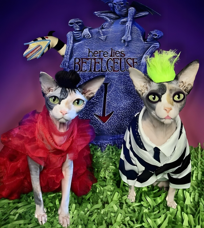 Whatever you do, don’t say Beetlejuice one more time! You never know what’s going to come out of the ground, but that doesn’t stop some people from turning on the juice and seeing what shakes loose. Yes, this is one of the best Beetlejuice-inspired costumes we’ve ever seen, and who better to pull it off than a couple of sphinxes? These cats are naturals when it comes to Halloween, as they already look so spooky.