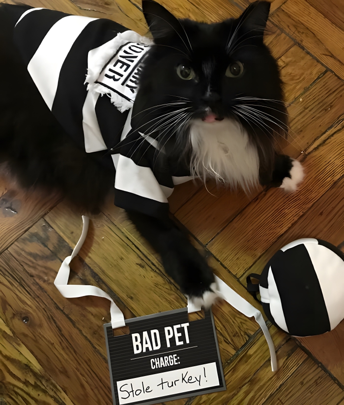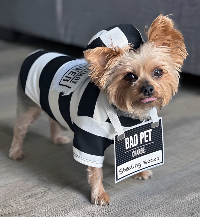 Anyone who has a dog will know that these animals are full of personality – and it’s these little nuggets of personality that can make choosing a pet Halloween costume so much easier! In the case of this little sock stealer, his pawrents knew exactly what they had to dress him up as. And when they had it, they arrested him on the spot and put him in his prisoner uniform.