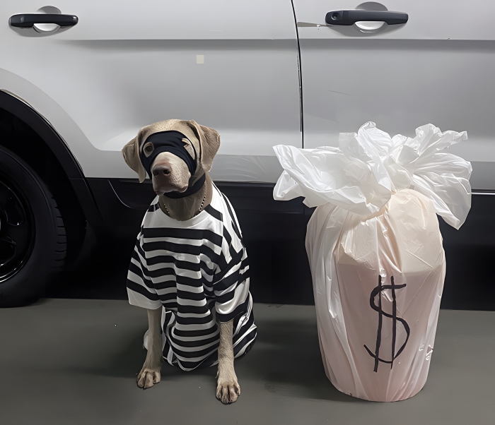From the big bag of cash to the striped T-shirt and the chain collar, this dog really does look the part. And we’d love to give a special shout-out to the mask, which looks like it was made from an old sock!